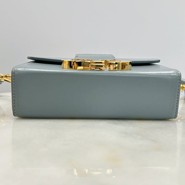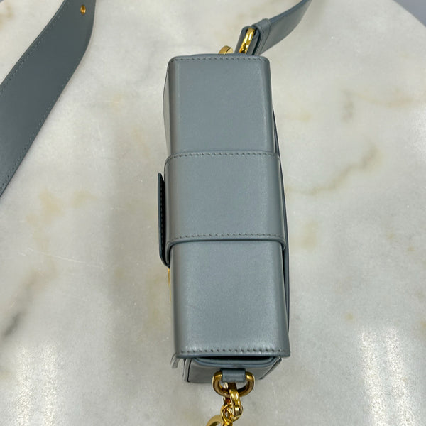 The bag is crafted in blue grey box calfskin for an elegant and modern look.