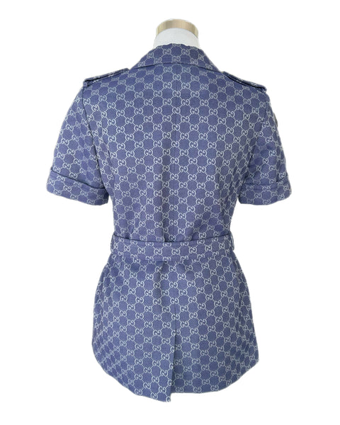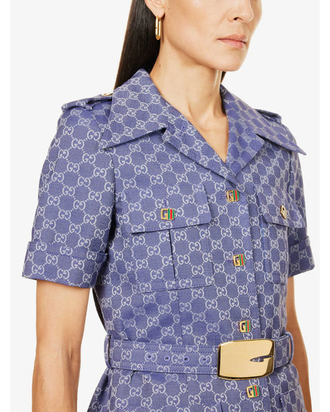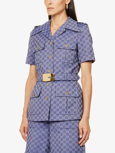 Gucci cotton-blend jacket. Exposed Enamel button fastenings at front, regular fit, collar, short sleeves, all-over brand monogram, four flap pockets at front, branded buttons, belt loops, lined.